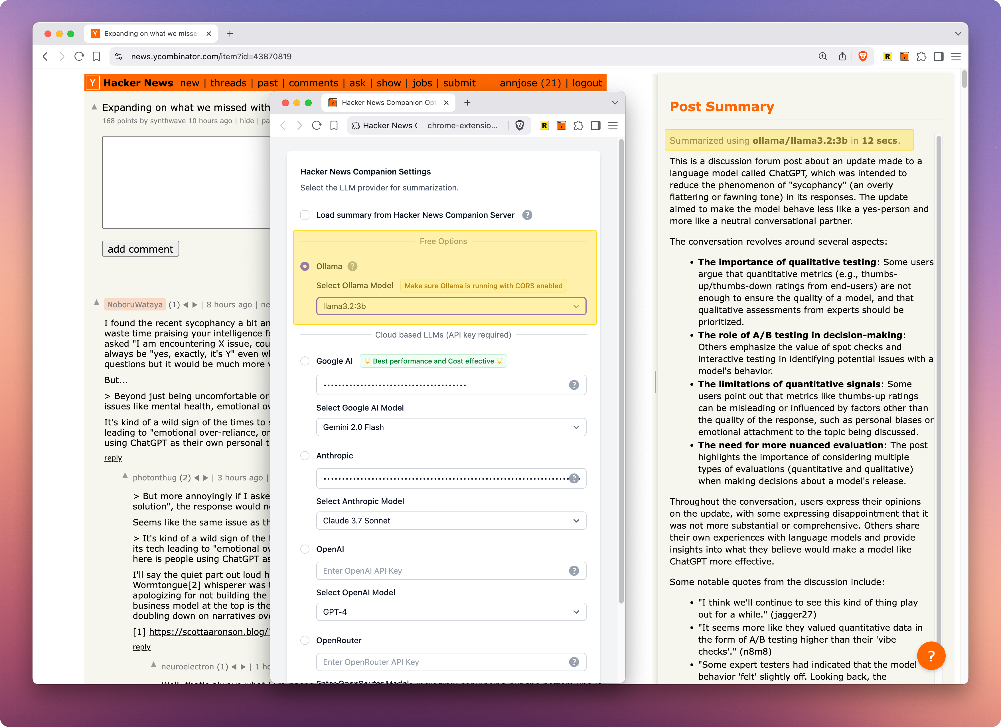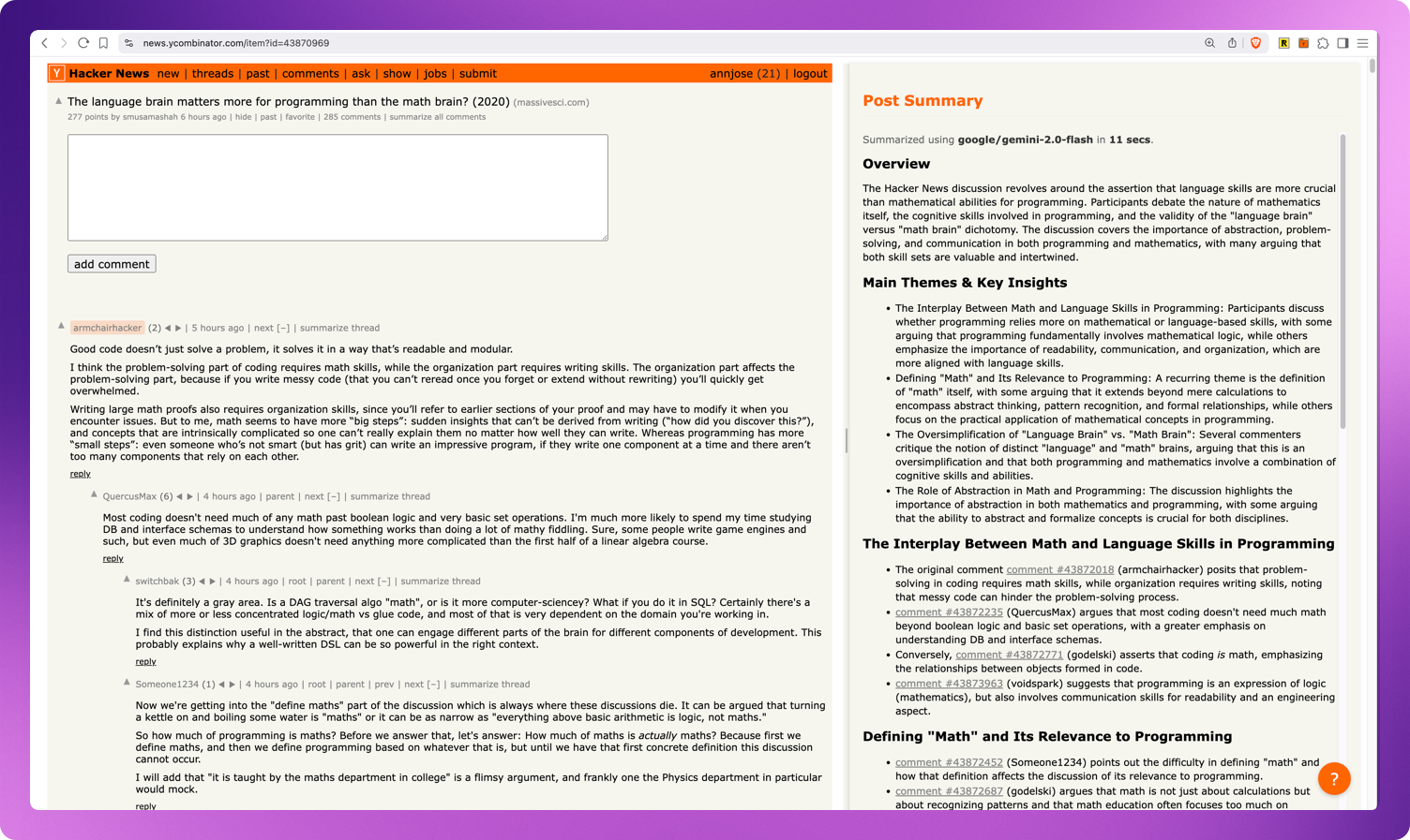 Summarize HN threads into main themes, key perspectives, comments, and side discussions - without reading everything.